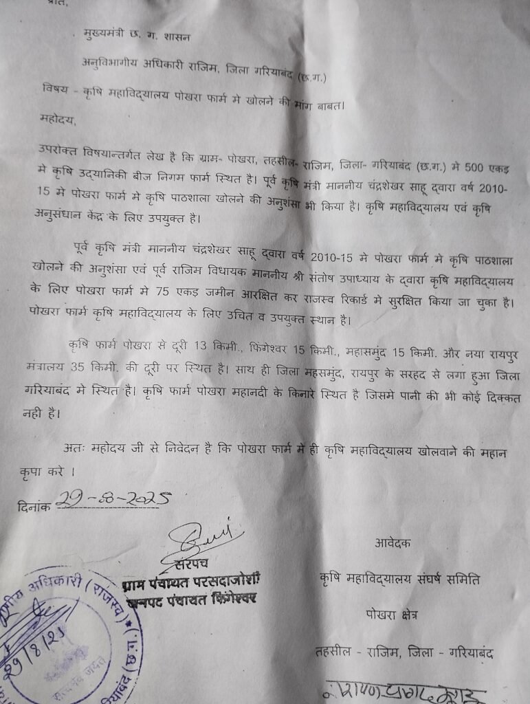 (जहां पोखरा में कृषि महाविद्यालय के भवन एवं अनुसंधान केंद्र को पोखरा चालू कराने मुख्यमंत्री जी के नाम श्री विष्णु देव साय के नाम से लिखित में ज्ञापन दिया)