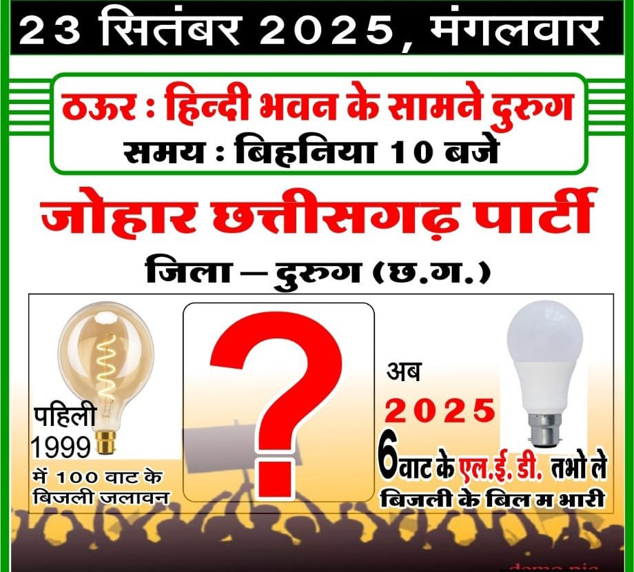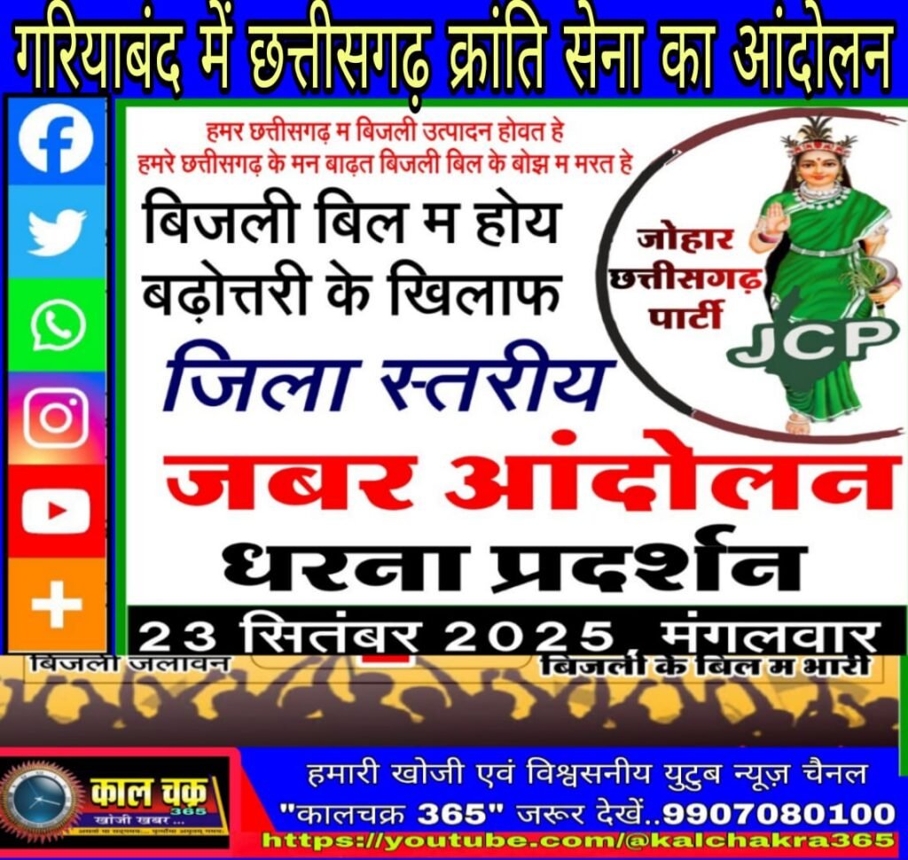 हम और पूरे छत्तीसगढ़ की जनता से अपील करते हैं कि 23 सितंबर 2025 को होने वाले जबर गोहार में अपना योगदान दे, साथ ही… गांधी मैदान गरियाबंद और राज्य के अन्य जिला मुख्यालयों में होने वाले जबर गोहार धरना प्रदर्शन में शामिल होकर अपनी आवाज बुलंद करें। यह आंदोलन केवल बिजली बिलों का विरोध नहीं, बल्कि छत्तीसगढ़ के आत्मसम्मान और जनता के हक की लड़ाई है।