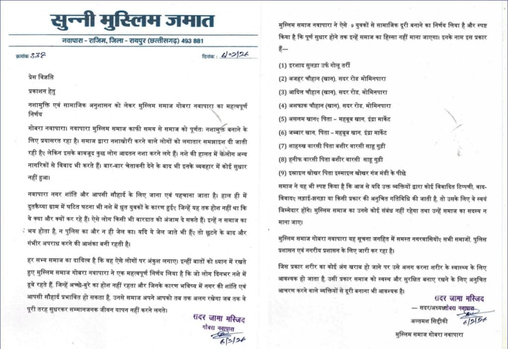 रानुप्रिया(रायपुर):- नवापारा नगर के मुस्लिम जमात आपसी वैमनस्यता हटाकर.. भाईचारा का उसूल कायम करने.. की अपील किया, और कहा-दुत्कैय्या में हुए ऐसे घृणित अपराधों का मूल जड नशा है, जिसे मुश्लिम समाज द्वारा अब पूरी तरह से प्रतिबंध लगाई जा रही है, वहीं इससे लिप्त दोषियो को मुस्लिम समाज बर्दाश्त नहीं करेगी, कठोर निर्णय लेते हुए चिन्हित नशेड़ियों का लिस्ट निकालकर उसे समाज से बहिष्कार करने का फरमान जारी किया गया.. दूसरी ओर अपराध में लिप्त दोषियों के खिलाफ कठोर कार्यवाही करते हुए उनके परिवार को समाज से बहिष्कृत कर जिला बदर की कार्यवाही करने की मांग प्रशासन से की है…